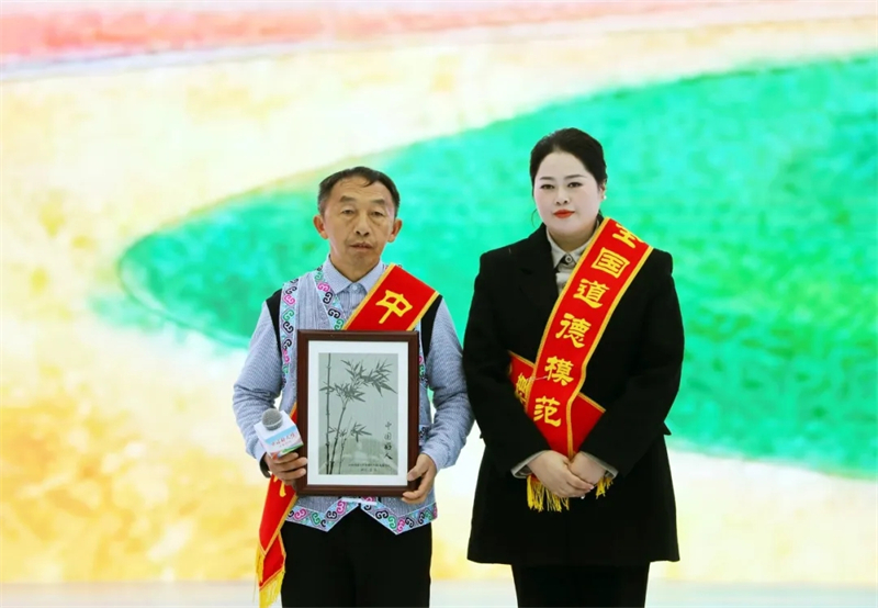 在活动现场,全国道德模范亲手赠予好人代表“道德传家宝”——江安竹簧竹编画。