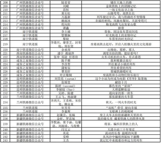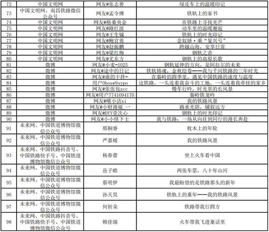 征集展示活动自今年9月25日开始,至11月30日结束,历时两个多月。其间,广大网友、旅客积极参与,用灵动的文字作品讲述生动鲜活的“我的铁路风景”故事;各承办平台共征集原创作品2万余个,遴选展示6000余个,全网话题传播量超4亿次。近日,活动承办平台“学习强国”学习平台、新华网客户端、中国青年报客户端、中国日报网、未来网、中国文明网、微博、《人民铁道》报业有限公司、中国铁道出版社有限公司、中国铁道博物馆、“中国铁路”及各铁路局集团公司新媒体平台,对遴选展示的作品进行了阅评,经活动组委会认定,最终产生了252件优秀作品。